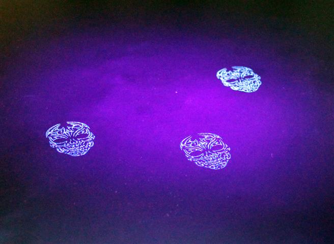 Notre encre UV 804 est également appelée encre à tampon phosphorescente ou à lumière noire. Elle est invisible à la lumière normale, en revanche elle devient jaunâtre à la lumière UV (longueur d’onde env. 370 nm). Des détecteurs correspondants sont disponibles sur demande.